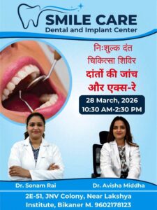 निःशुल्क दंत चिकित्सा शिवर कल बीकानेर, 27 मार्च। जय नारायण व्यास कॉलोनी में महाराणा प्रताप पार्क के पास 2 ई 51 में स्थित ’’स्माइल केयर’’ डेंटल एंड इम्पलांट सेंटर में