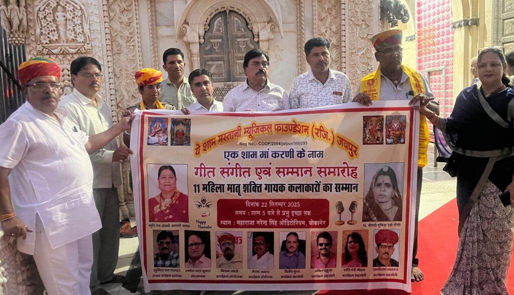 बीकानेर। ये शाम मस्तानी म्यूजिकल फाउण्डेशन ( रजि.) जयपुर द्वारा एक शाम मां करणी के नाम गीत संगीत एवं सम्मान समारोह 11 महिला मातृ शक्ति गायक कलाकारों का सम्मान कार्यक्रम आगामी 22 सितंबर को महाराजा नरेंद्र सिंह ऑडोटोरियम हॉल में किया जा रहा है, जिसके बैनर का विमोचन शुक्रवार की शाम देश्नोक स्थित मां करणी […]
