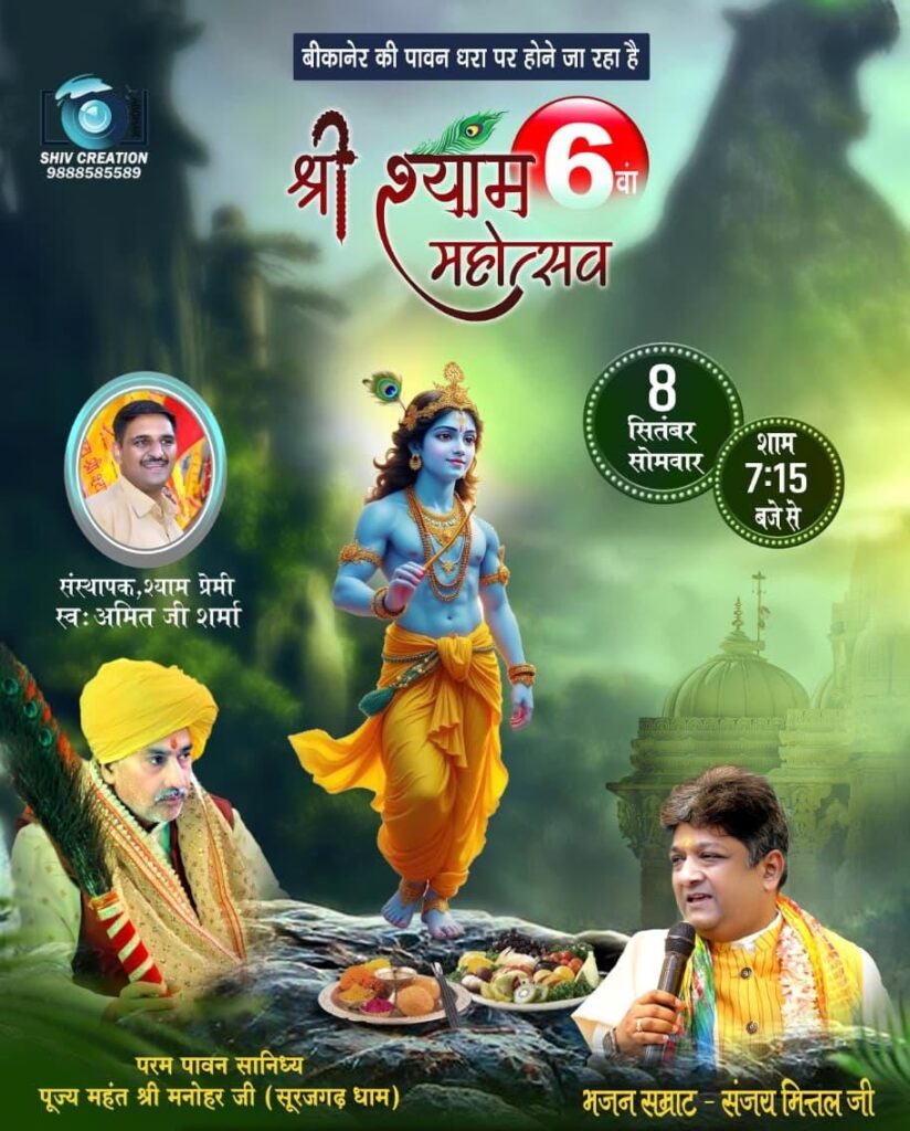 बीकानेर 8 सितंबर 2025 को होने जा रहा !रात्रि 7.15 से प्रभु इच्छा तक बाबा का गुणगान महंत श्री मनोहर जी प्राचीन श्याम मंदिर सूरजगढ़ धाम के नेतृत्व में होगा। भजन सम्राट संजय जी मित्तल कलकत्ता से अपने भजनों से बाबा को रिझाएंगे। संजय मित्तल जी के साथ संदीप राजस्थानी चूरू से,मास्टर नानू & रामदेव […]