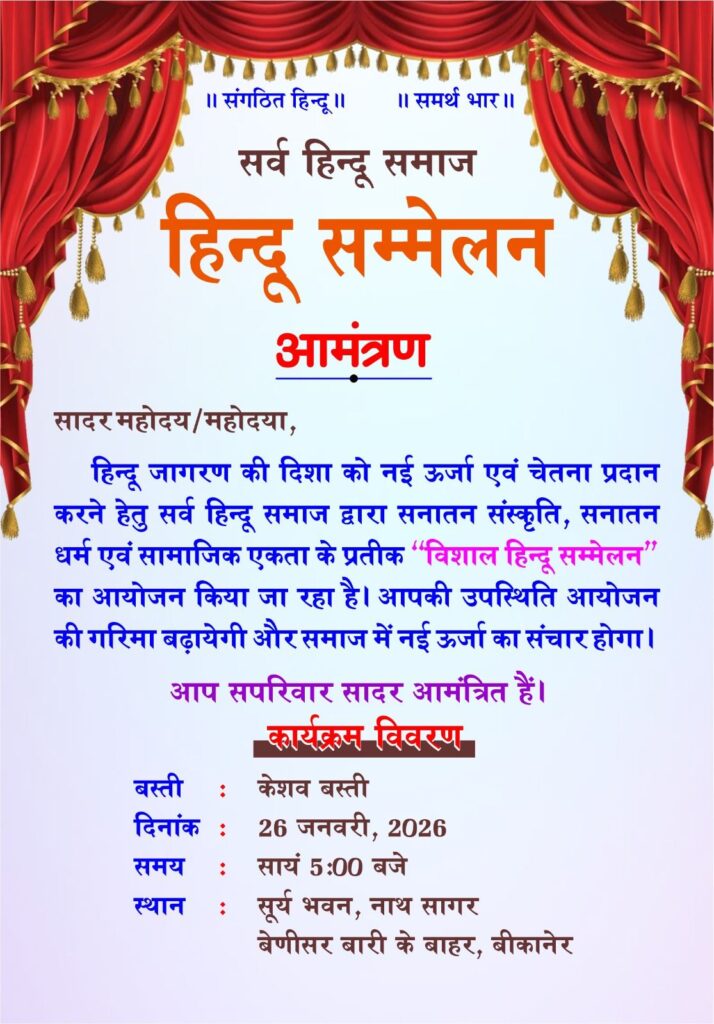 “विराट हिन्दू सम्मेलन” बीकानेर: 24 जनवरी लक्ष्मीनाथ नगर स्थित केशव बस्ती में सकल हिन्दू समाज द्वारा हिंदू समाज को संगठित और सामाजिक समरसता के उद्देश्य से विराट हिन्दू सम्मेलन का आयोजन 26 जनवरी 2026 को सायं 5:00 बजे सुर्य भवन,नाथ सागर बेनीसर बारी के बाहर किया जा रहा है। बस्ती में हिंदू सम्मेलन को वृहद […]