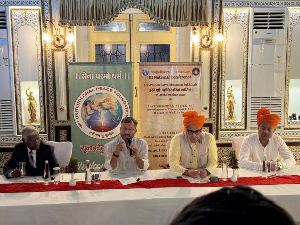 यूनाइटेड ग्लोबल पीस फाऊंडेशन,वैशाली नगर, जयपुर बीकानेर: यूनाइटेड ग्लोबल पीस फाउंडेशन का राष्ट्रीय सम्मेल बीकानेर: यूनाइटेड ग्लोबल पीस फाउंडेशन का राष्ट्रीय सम्मेलन 11–12 अक्टूबर को बीकानेर के लक्ष्मी निवास पैलेस में यूनाइटेड ग्लोबल पीस फाउंडेशन (UGPF) द्वारा 11–12 अक्टूबर को राष्ट्रीय सम्मेलन आयोजित किया जाएगा। सम्मेलन का विषय है – “एचआर–सीएसआर ऑन सर्वे भवन्तु सुखिनः”, […]