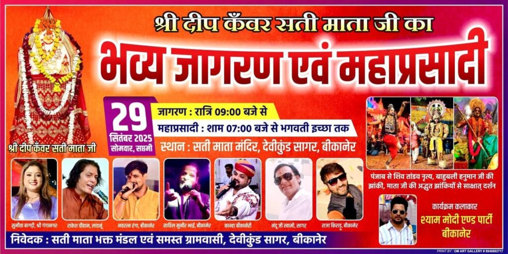देवीकुंड सागर में होगा दीप कुँवर सती माता जी का भव्य जागरण व महाप्रसादी बीकानेर। देवीकुंड सागर स्थित सती माता मंदिर परिसर में आगामी सोमवार, 29 सितंबर 2025 (सप्तमी) को दीप कुँवर सती माता जी का भव्य जागरण एवं महाप्रसादी का आयोजन होगा। आयोजकों ने बताया कि महाप्रसादी का आरंभ शाम 7 बजे से होगा, […]