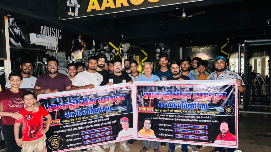 शाकद्वीपीय समाज बेंच प्रेस 15 जून 2025 को होने वाली प्रतियोगिता का पोस्टर का विमोचन आज आरोग्यम जिम मोहता चौक में हुवा