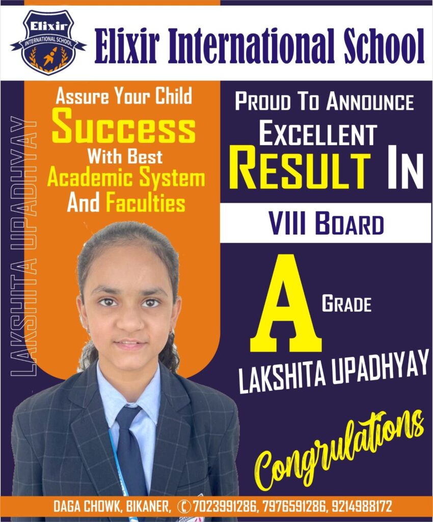 बीकानेर डागा चौक स्थित ELIXIR INTERNATIONAL SCHOOL लगातार अपनी सफलता का परचम फहरा रही है गत दिनों जहां 12 वी साइंस आर्ट्स में शहरी में ELIXIR ने अपना लोहा मनवाया । आज 26-05-2025 साय 5 बजे बाद जैसे ही 8वी बोर्ड का परिणाम आया । आज पूरा शहर ELIXIR मय हो गया । विद्यालय […]