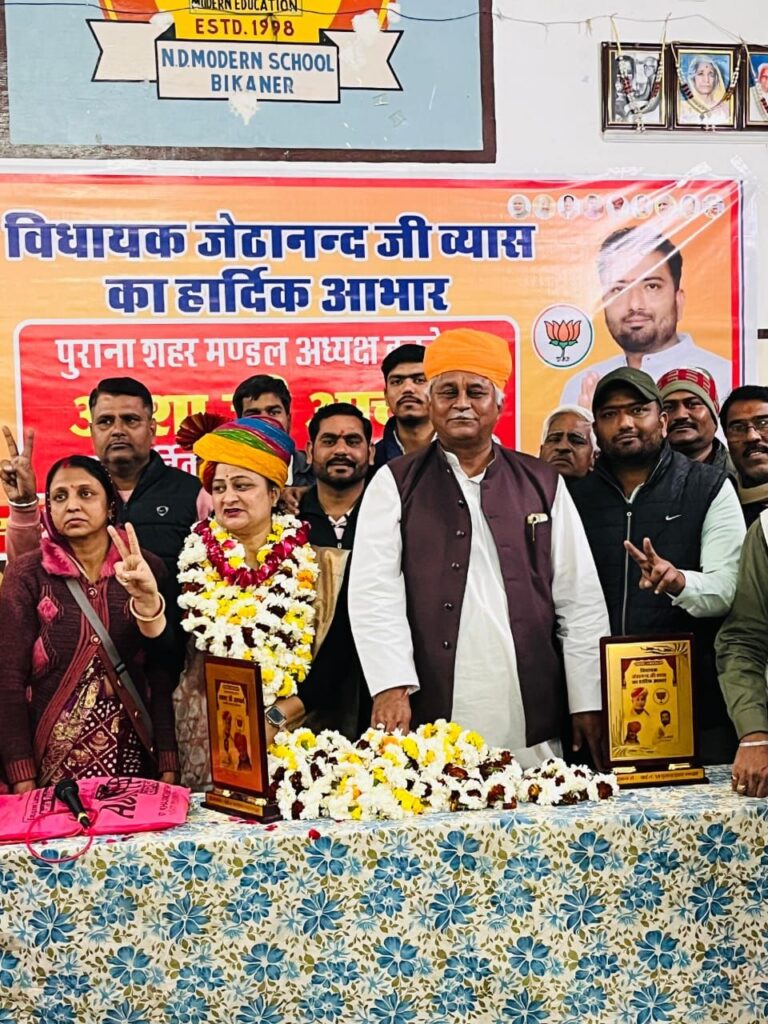 विधायक जेठानंद व्यास का अभिनंदन, आशा आचार्य का सम्मान बीकानेर। भारतीय जनता पार्टी के पुराना शहर मंडल की अध्यक्ष आशा आचार्य का सम्मान समारोह भाजपा नेता अनिरुद्ध आचार्य के नेतृत्व में आयोजित हुआ। अनिरुद्ध आचार्य ने आशा आचार्य को संगठन के प्रति निष्ठावान बताते हुए उनके उज्ज्वल भविष्य की कामना की। कार्यक्रम में बीकानेर पश्चिम […]