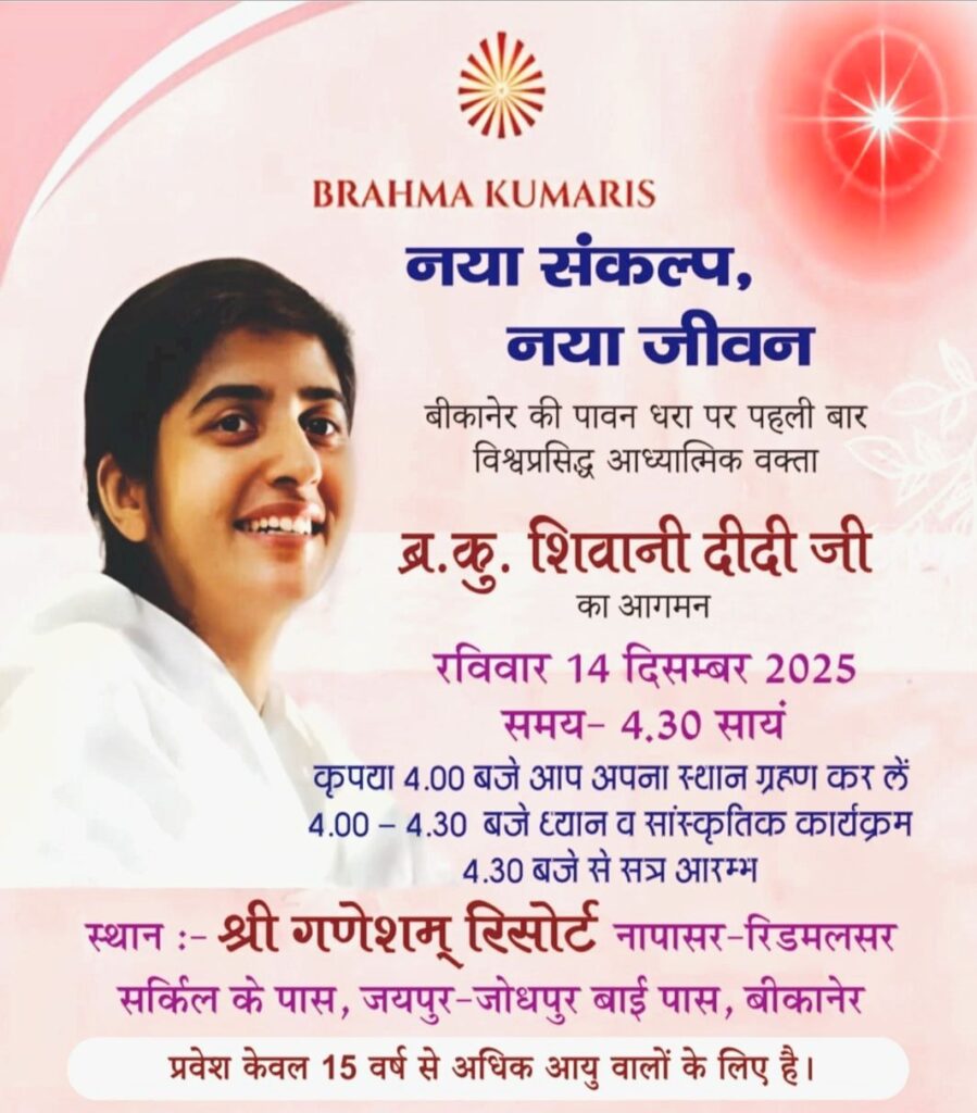 बीकानेर। प्रजापिता ब्रह्माकुमारी ईश्वरीय विश्वविद्यालय, बीकानेर के संभागीय केन्द्र की ओर से रविवार को शाम चार बजे से छह बजे तक जयपुर जोधपुर बाईपास पर नापासर रिडमलसर सर्किल के पास गणेशम रिसोर्ट पर विश्व विख्यात मोटिवेशनल वक्ता शिवानी दीदी का ’’नया संकल्प, नया जीवन’’ विषय पर व्याख्यान रखा गया है।प्रजापिता ब्रह्माकुमारी ईश्वरीय विश्व विद्यालय की […]
