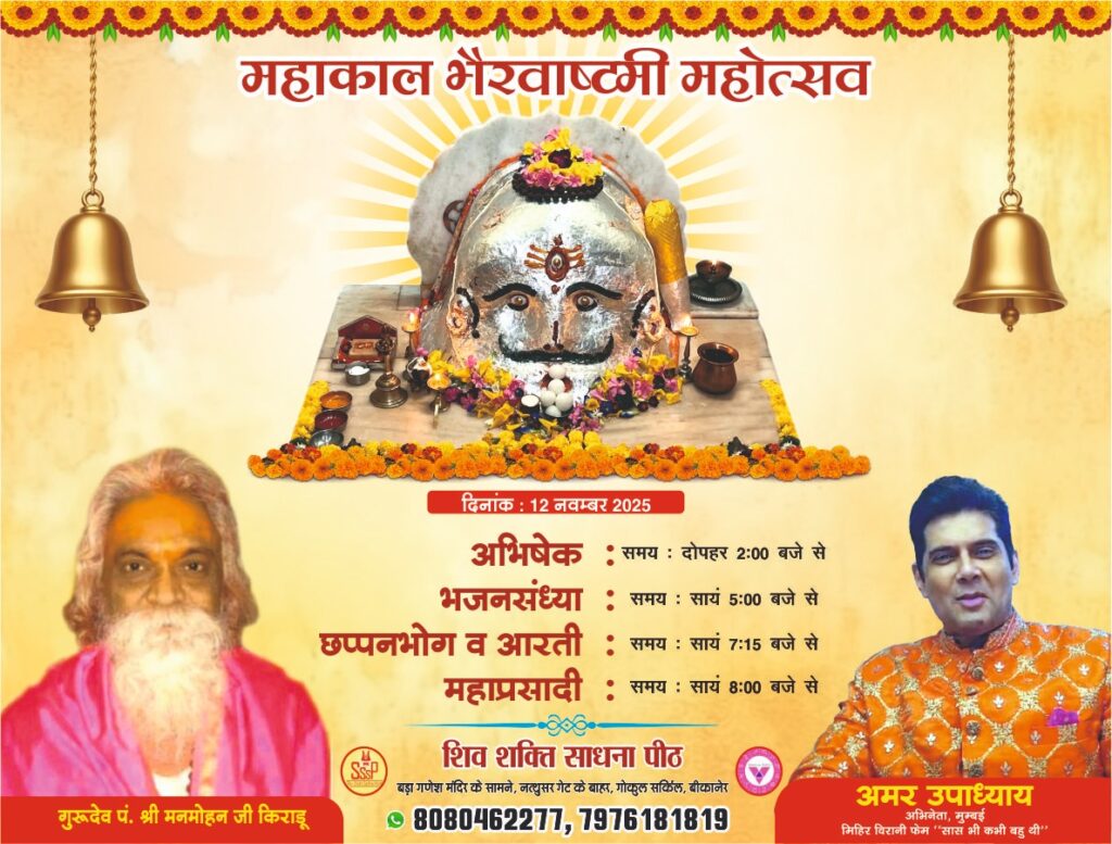 प्रख्यात भैरव उपासक पंडित मनमोहन किराडू द्वारा स्थापित शिव शक्ति साधना पीठ में हर वर्ष की भांति इस वर्ष भी महाकाल भैरव अष्टमी का आयोजन प्रख्यात ज्योतिष आचार्य पंडित प्रदीप किराडूके नेतृत्व में हो रहा है पीठ से जुड़े एडवोकेट मदन गोपाल व्यास ने बताया कि हर वर्ष की भांति इस वर्ष भी फिल्मी व […]