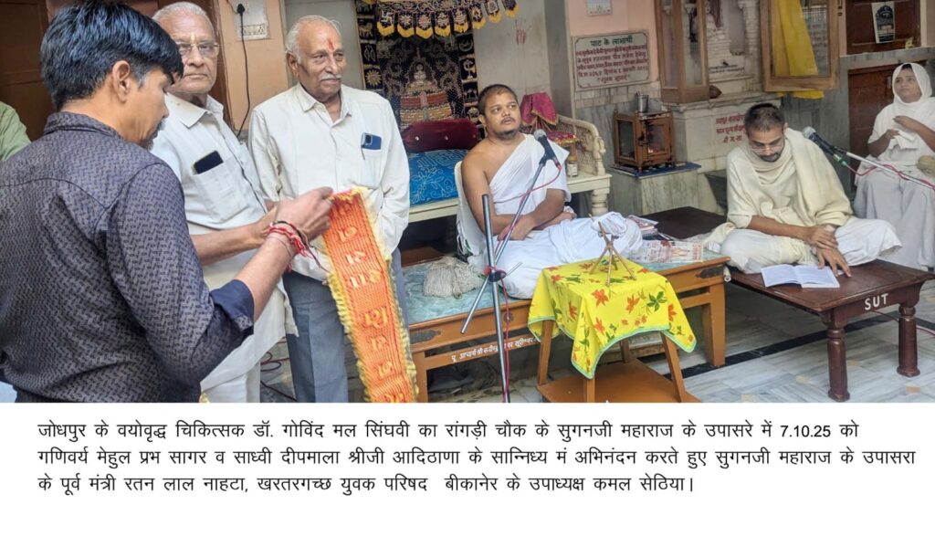 तप आत्म शुद्धि के संस्कार को सुदृढ़ करता है-गणिवर्य मेहुल प्रभ सागर म.सा.बीकानेर, 7 अक्टूबर। आध्यात्मिक नवपद ओली पर्व के नौवेंं दिन मंगलवार को रांगड़ी चौक के सुगनजी महाराज के उपासरे में गणिवर्य मेहुल प्रभ सागर म.सा., मुनि मंथ प्रभ सागर, बाल मुनि मीत प्रभ सागर, बीकानेर की साध्वी दीपमाला व शंखनिधि श्रीजी क सान्निध्य […]
