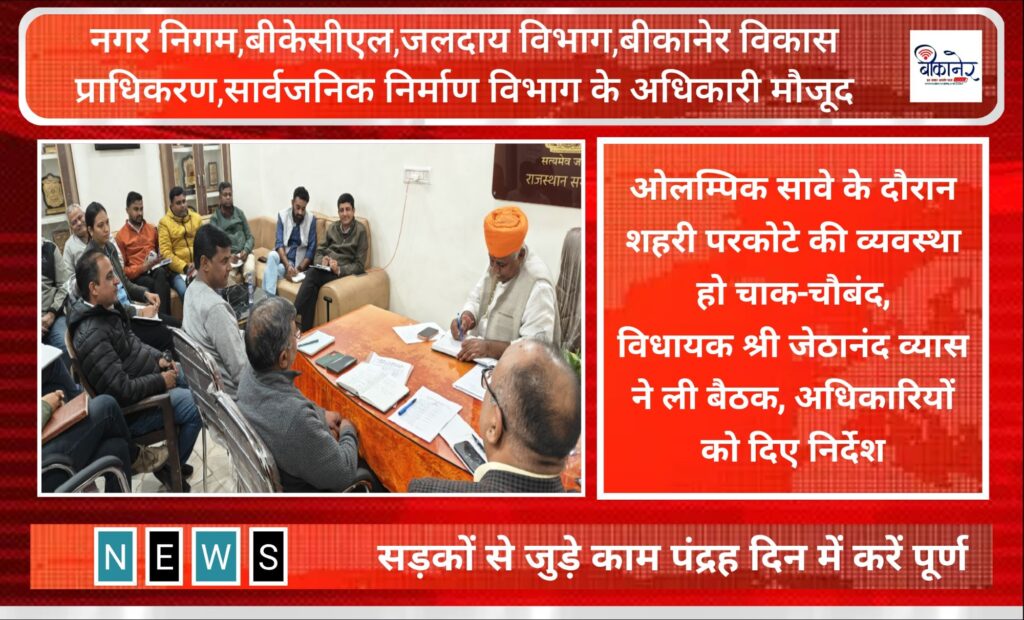 नगर निगम, बीकेसीएल, जलदाय विभाग, बीकानेर विकास प्राधिकरण तथा सार्वजनिक निर्माण विभाग के अधिकारी मौजूद। विधायक श्री जेठानंद व्यास ने ली बैठक, अधिकारियों को दिए निर्देश बीकानेर, 16 जनवरी। बीकानेर पश्चिम विधायक श्री जेठानंद व्यास ने शुक्रवार को विधायक जनसुनवाई केन्द्र में बैठक लेकर विभिन्न विभागों के अधिकारियों को 10 फरवरी को होने वाले पुष्करणा […]