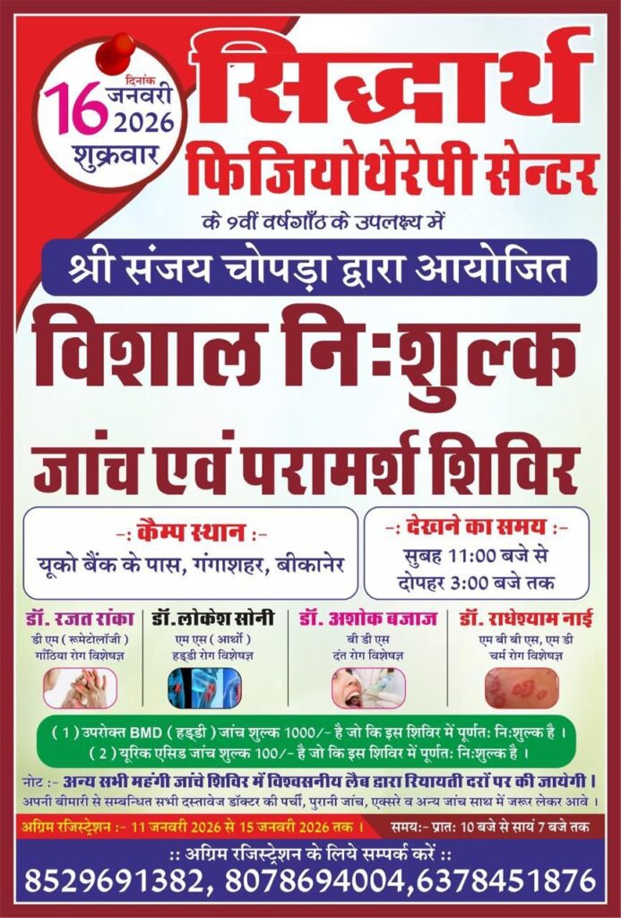 सिद्धार्थ फिजियोथैरेपी सेंटर की नौवीं वर्षगांठ पर नि:शुल्क जांच व परामर्श शिविर शुक्रवार कोबीकानेर। गंगाशहर में यूको बैंक के समीप स्थित सिद्धार्थ फिजियोथैरेपी सेंटर 16 जनवरी 2026 को नौंवी वर्षगांठ मनाने जा रहा है। फिजियोथैरेपिस्ट डॉ. निमित सक्सेना ने बताया कि समाजसेवी संजय चौपड़ा के सौजन्य से विगत नौ वर्षों से सिद्धार्थ फिजियोथैरेपी सेंटर का […]