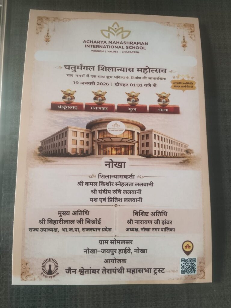 चतुर्मंगल शिलान्यास महोत्सवआचार्य महाश्रमण इन्टरनेशनल विधालय का शिलान्यास समारोह 19 जनवरी दोपहर 1.31 बजे जैन संस्कार विधि से सम्पन्न होगा |विधा का विकास हो , संस्कार सम्पन नैतिक शिक्षा दी जाय इस हेतु सम्पूर्ण देश में तेरापंथ महासभा द्वारा सघन अभियान चलाया जा रहा |वरिष्ठ संस्कारक एवं महासभा उपाध्यक्ष श्री संजय जी खट्टेड़ विशेष रूप […]