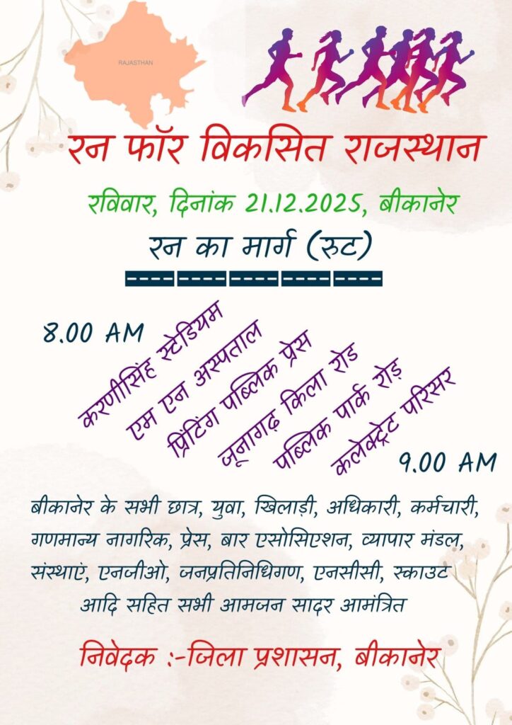 बीकानेर, राज्य सरकार के कार्यकाल के दो वर्ष पूर्ण होने के उपलक्ष्य में रविवार प्रातः 8 बजे ‘रन फॉर विकसित राजस्थान’ का आयोजन किया जाएगा। रन डॉ. करणी सिंह स्टेडियम से शुरू होकर एमएन अस्पताल, गवर्नमेंट प्रेस रोड, जूनागढ़ होते हुए पब्लिक पार्क परिसर पहुंचेगी। जहां कलेक्टर कार्यालय के सामने इसका समापन होगा। अतिरिक्त जिला […]