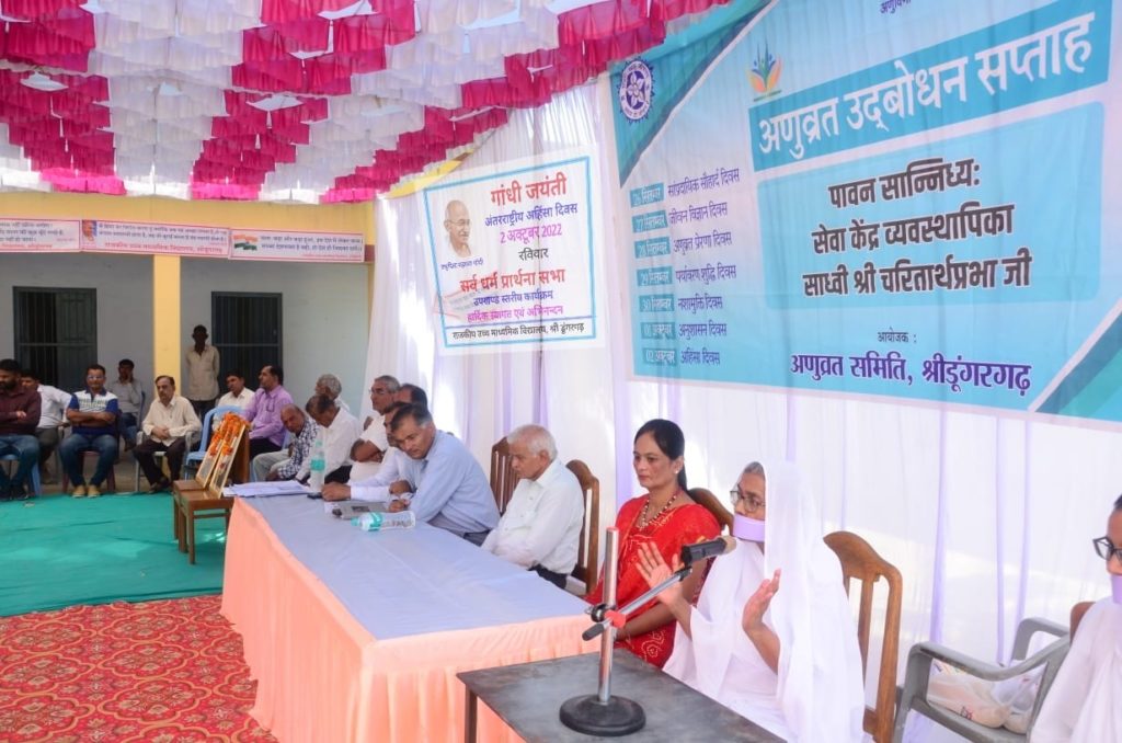 श्री डूंगरगढ़, अहिंसा जीवन का प्राण तत्व है। व्यक्ति अहिंसक रहकर ही अच्छे समाज का निर्माण कर सकते हैं। ये विचार पूर्व कुलपति एवंअहिंसा की प्रतिरूप साध्वी चरितार्थप्रभा नेरखे। वे रविवार को कस्बे के राजकीय उच्च माध्यमिक विद्यालय में गांधी जयन्ती एवं विश्व अंहिसा दिवस के अवसर पर शिक्षा विभाग एवं स्थानीय अणुव्रत समिति के […]