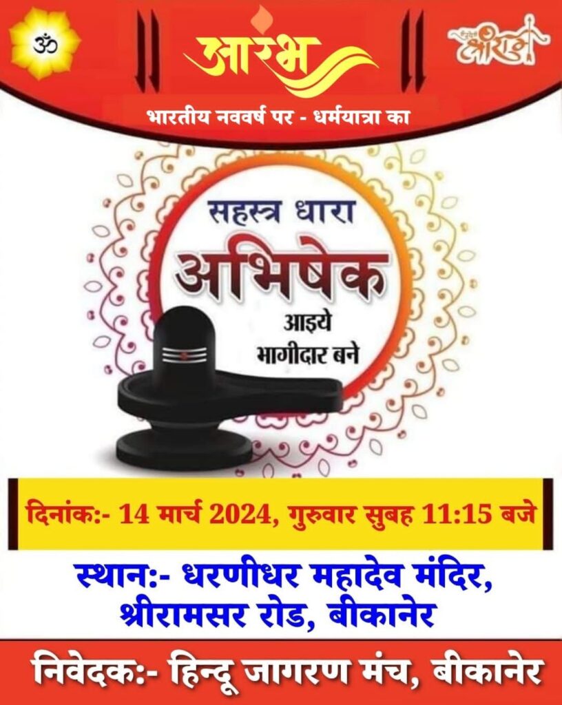 बीकानेर कल हिन्दु जागरण मंच के द्वारा स्थानीय धरणीधर महादेव मन्दिर में महादेव का सहस्त्र धारा जलाभिषेक कर विधिवत् रूप से चैत्र शुक्ल प्रतिपदा पर आयोजित होने वाली धर्मयात्रा एंव महाआरती का शुभारम्भ किया जायेगा प्रतिवर्ष की भांति इस वर्ष भी भारतीय नववर्ष पर हिन्दु जागरण मंच के द्वारा धर्मयात्रा एंव महाआरती का आयोजन किया […]