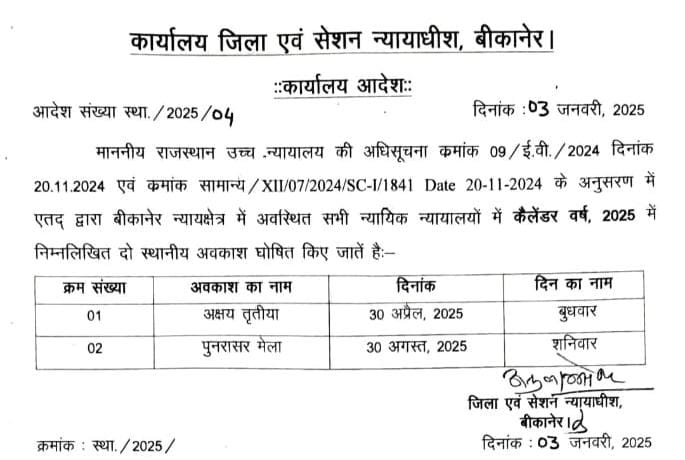 बीकानेर 3 जनवरी 2024। जिले से खास खबर नए साल में दो अवकाश घोषणा की आई है। जिला एवं सेशन न्यायाधीश ने बीकानेर न्यायक्षेत्र के सभी न्यायालयों में कैलेंडर वर्ष 2025 में दो स्थानीय अवकाश घोषित किए है। 30 अप्रैल 2025 को अक्षय तृतीया व 30 अगस्त 2025 को पूनरासर मेले पर अवकाश की घोषणा […]