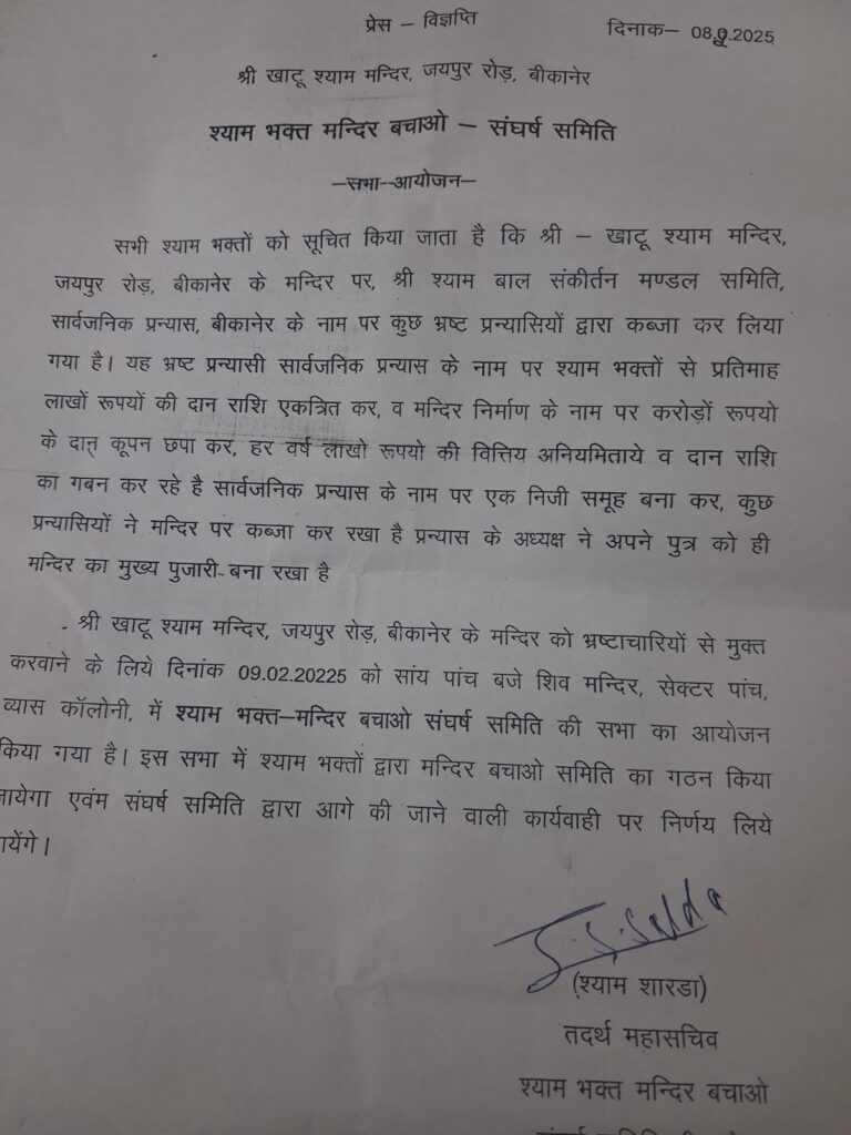 *श्याम भक्तों मंदिर बचाओ समिति की मीटिंग 9 फरवरी को*