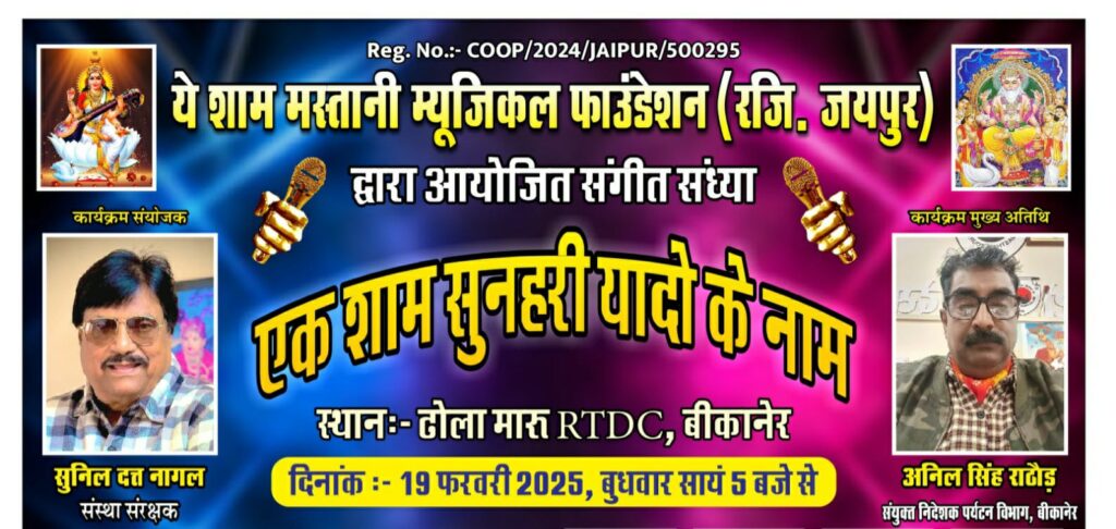 बीकानेर। ये शाम मस्तानी म्यूजिकल फाउण्डेशन (रजि. जयपुर) द्वारा आगामी 19 फरवरी बुधवार की सांय ढोला मारू होटल प्रांगण में ( एक शाम सुनहरी यादों के नाम) गीत संगीत एवं स्वागत सम्मान कार्यक्रम का आयोजन किया जाएगा। कार्यक्रम के संयोजक सुनील दत्त नागल ने गुरुवार को जानकारी देते हुए बताया कि कार्यक्रम के मुख्य अतिथि […]
