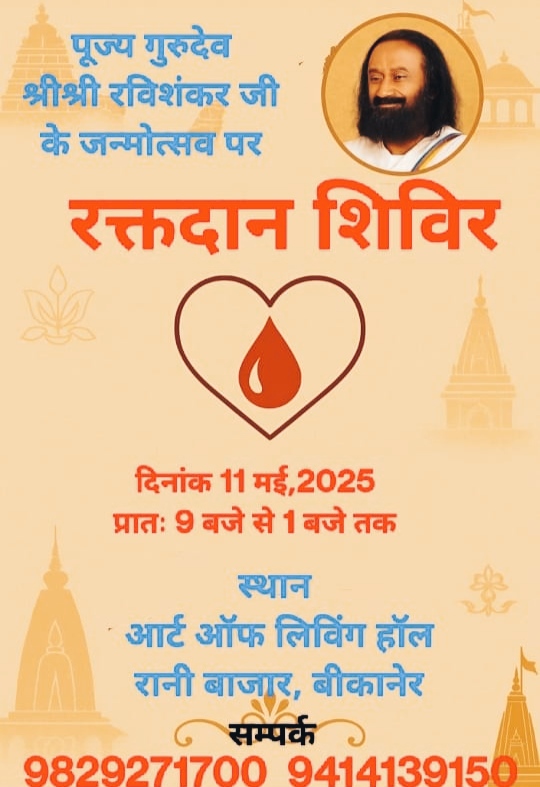 11 से 18 मई तक होंगे विभिन्न कार्यक्रम रक्तदान शिविर, सुमेरू भजन संध्या एवं हैप्पीनेस कोर्स के होंगे आयोजन बीकानेर। दी आर्ट ऑफ लिविंग के संस्थापक श्री श्री रविशंकर जी के जन्मदिवस के उपलक्ष्य में संस्था के बीकानेर केंद्र द्वारा हैप्पीनेस महोत्सव का आयोजन 11 से 18 मई तक किया जाएगा। आर्ट ऑफ लिविंग ब्यूरो […]