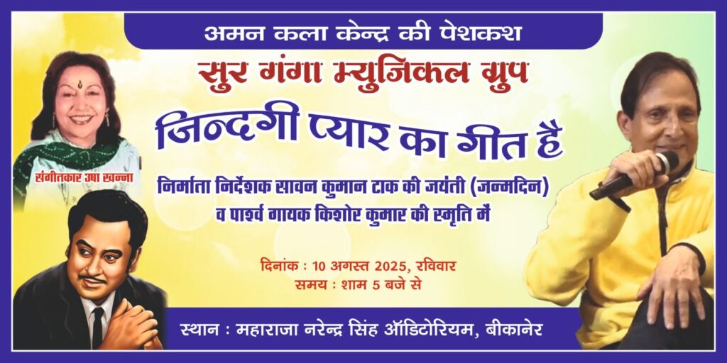 जिंदगी प्यार का गीत है 10 अगस्त को सुर गंगा म्यूजिकल ग्रुप बीकानेर द्वारा महान पार्श्व गायक किशोर कुमार की स्मृति व फिल्म निर्माता निर्देशक सावन कुमार टॉक की जयंती जन्मदिन व संगीतकार उषा खन्ना की लंबी उम्र की कामना करते हुए जिंदगी प्यार का गीत है कार्यक्रम 10 अगस्त रविवार को महाराजा नरेंद्र सिंह […]
