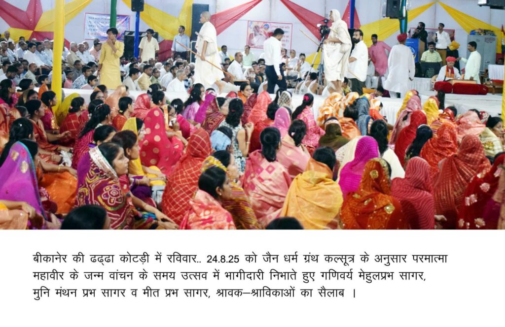 भगवान महावीर स्वामी के सिद्धान्त व आदर्श अनुकरणीय-गणिवर्य मेहुलप्रभ सागर बीकानेर, 24 अगस्त। जिनालय पूजा, परमात्म भक्ति, दर्शन, वंदन करने वाले जैन श्वेताम्बर खरतरगच्छ, तपागच्छ में रविवार को अहिंसा परमोः धर्मःका संदेश देने वाले भगवान महावीर के आदर्शों, उनकी माता त्रिशला देवी को स्वप्न में दिखाई दी 14 वस्तुओं की बोलियों व जन्म वांचन वांचन […]