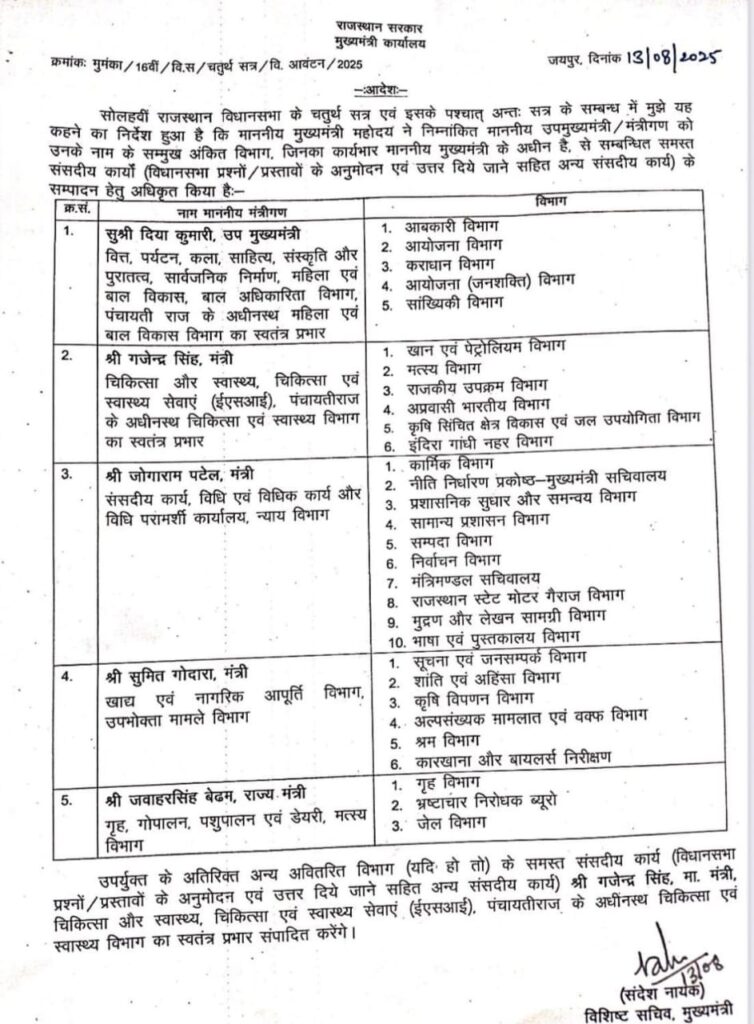 5 मंत्रियों को किया गया अधिकृत, डिप्टी सीएम दीया कुमारी, मंत्री गजेंद्र सिंह खींवसर, सुमित गोदारा, जोगाराम पटेल, जवाहर सिंह बेढ़म अधिकृत, सीएमओ ने जारी किए आदेश ।