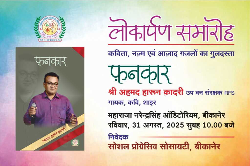 सोशल प्रोगेसिव सोसायटी के तत्वावधान में आगामी 31 अगस्त को सुबह 10 बजे महाराजा नरेंद्र सिंह ऑडिटोरियम में बीकानेर के जाने-माने गायक, कवि शायर अहमद हारून कादरी,उप वन संरक्षक द्वारा रचित शे’र,नज़्म आज़ाद गजलों के प्रथम काव्य संग्रह “फ़नकार” के विमोचन का कार्यक्रम आयोजित किया जाएगा । सोशल प्रोगेसिव सोसायटी के अध्यक्ष नदीम अहमद ‘नदीम’ […]
