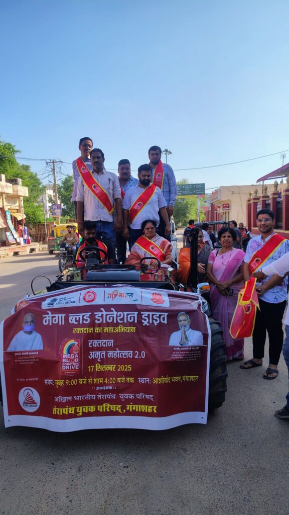 बीकानेर । प्रधानमंत्री नरेंद्र मोदी के जन्मदिन के उपलक्ष में 17 सितंबर 2025 तेरापंथ भवन में रक्तदान शिविर के लिए भारतीय जनता पार्टी व तेरापंथ युवक परिषद के संयुक्त तत्वधान में गंगाशहर में रक्तदान जागरूकता वाहन रैली जिला अध्यक्ष सुमन छाजेड़ ओर तेरापंथ युवक परिषद के संयुक्त नेतृत्व में निकाली गई ।मीडिया संयोजक कमल गहलोत […]