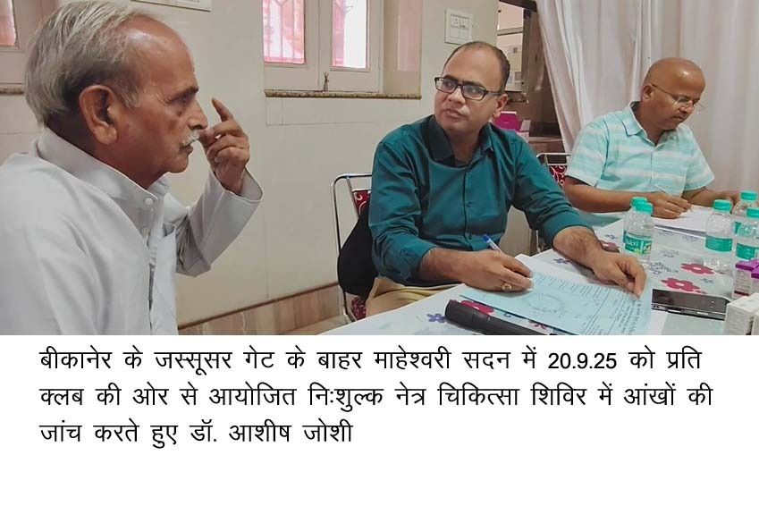 बीकानेर, 20 सितम्बर। जिला अंधता निवारण समिति के तत्वावधान में समाज सेवी मोहन लाल थिरानी की पुण्य तिथि पर प्रीति क्लब, बीकानेर एवं आचार्यश्री नानेश रोटरी नेत्र चिकित्सालय,गंगाशहर व थिरानी परिवार, की ओर से जस्सूसर गेट के बाहर कोठारी अस्पताल मार्ग स्थित माहेश्वरी सदन में शनिवार को निःशुल्क नेत्र चिकित्सा शिविर आयोजित किया गया शिविर […]
