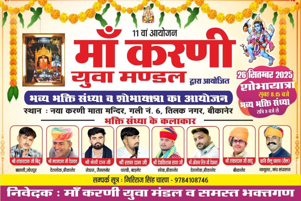 36 कोम की आराध्य देवी मां करणी का हर साल की भांति इस बार भी दिनांक 26 सितंबर 2025 को 11 वां आयोजन मां करणी युवामंडल नये करणी माता मंदिर तिलकनगर में होने जा रहा है। जिसमें राजस्थान के जाने माने गायक कलाकर अपनी मधुर वाणी में चिरजाओं की प्रस्तुति देंगे जो इस प्रकार […]