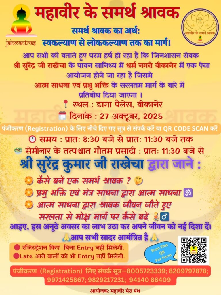 बीकानेर। महावीर मेरा पंथ की ओर से 27 अक्टूबर सोमवार को गंगाशहर के डागा पैलेस परिसर में ’’भगवान महावीर के समर्थ श्रावक विषयक वहृद सेमिनार का आयोजन सुबह साढ़े आठ बजे से साढ़े ग्यारह बजे तक किया जाएगा। मुख्य वक्ता जैन धर्म व संस्कृति के ज्ञाता महावीर मेरा पंथ, जैनीजम डॉट,कॉम के संस्थापक सुरेन्द्र कुमार […]