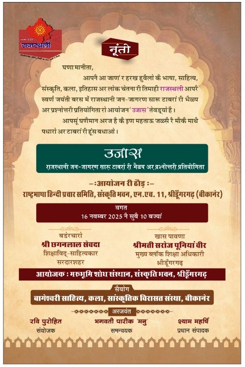*राजस्थानी भाषा जन जागरण अभियान कल से- “उजास” समारोह का आयोजन 16 नवम्बर को*