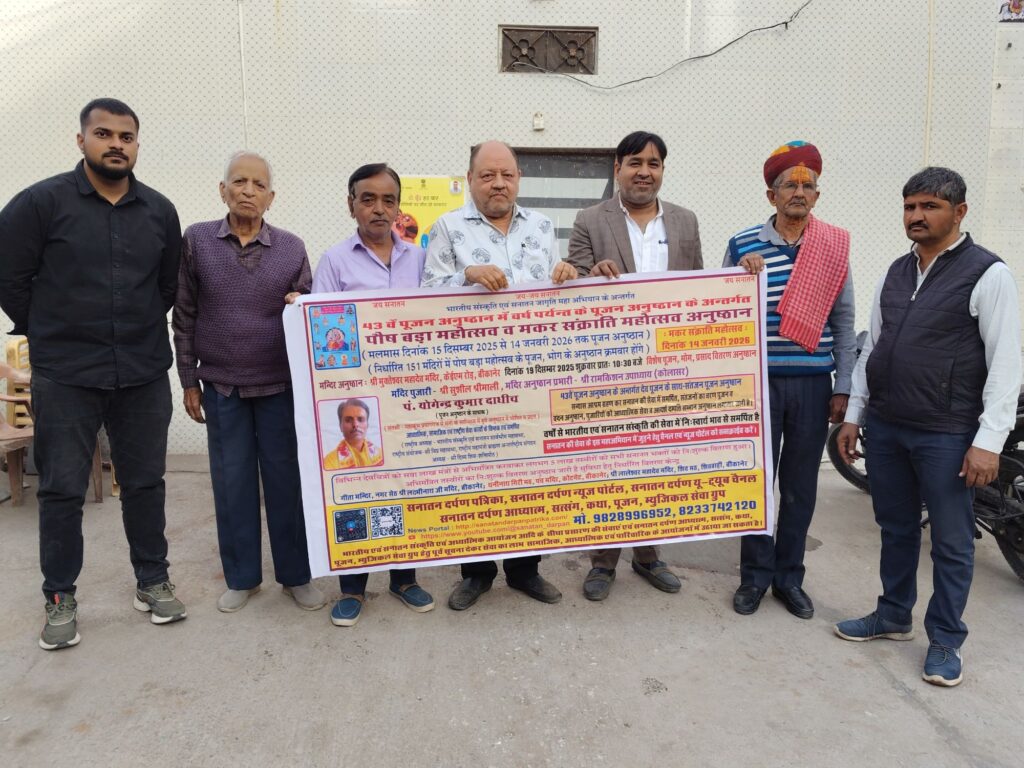 *गंगाशहर में पांच दिवसीय श्री करणी कथा का आज भव्य समापन बीकानेर। गंगाशहर क्षेत्र में आचार्य तुलसी समाधि स्थल से आगे, विश्वकर्मा कॉलोनी में आयोजित पांच दिवसीय संगीतमय **श्री करणी कथा** का आज श्रद्धा और भक्ति के वातावरण में भव्य समापन होगा। कथा की पूर्णाहुति के अवसर पर श्रद्धालुओं में विशेष उत्साह देखा जा रहा […]
