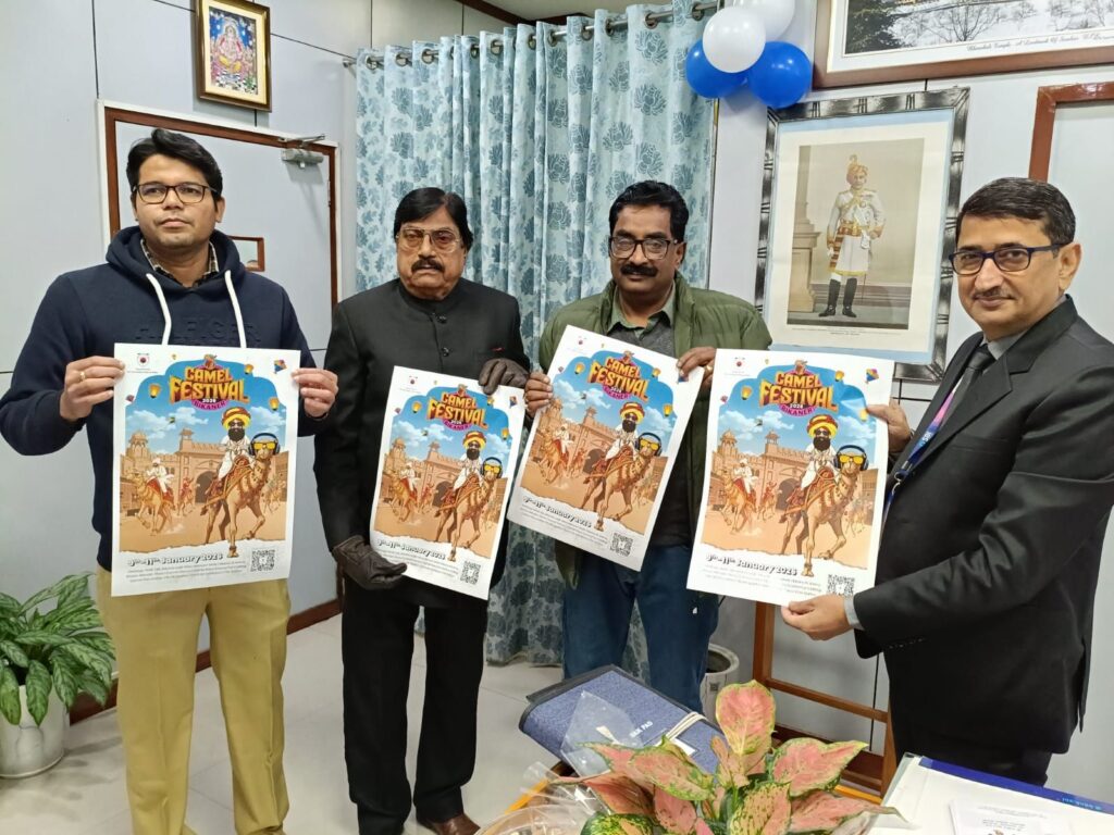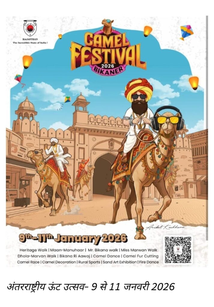 अंतरराष्ट्रीय ऊंट उत्सव- 9 से 11 जनवरी 2026 09 जनवरी को हेरिटेज वॉक से होगी ऊंट उत्सव की रंगारंग शुरुआत पहले दिन धरणीधर ग्राऊंड में होंगे बड़े आयोजन धरणीधर ग्राऊंड में प्राऊड एंड प्राइड ऑफ बीकानेर एवं वॉयस ऑफ बीकानेर कार्यक्रम का आयोजन जिला उद्योग संघ में होगा ”ट्रेडिशनल बीकानेरी फूड फेस्टिवल” का आयोजन डॉ […]