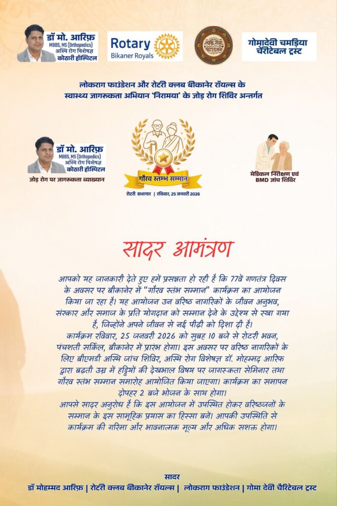 जोड़ रोग जागरूकता शिविर एवं 100 वरिष्ठ नागरिक सम्मान समारोह रविवार को होगा आयोजित बीकानेर, 24 जनवरी 2026। गणतंत्र दिवस की पूर्व संध्या पर बीकानेर में स्वास्थ्य जागरूकता और सामाजिक सम्मान का विशेष कार्यक्रम आयोजित होने जा रहा है। लोकराग फाउंडेशन, रोटरी क्लब ऑफ बीकानेर रॉयल्स तथा डॉ. मोहम्मद आरिफ के संयुक्त तत्वावधान में सोमवार […]