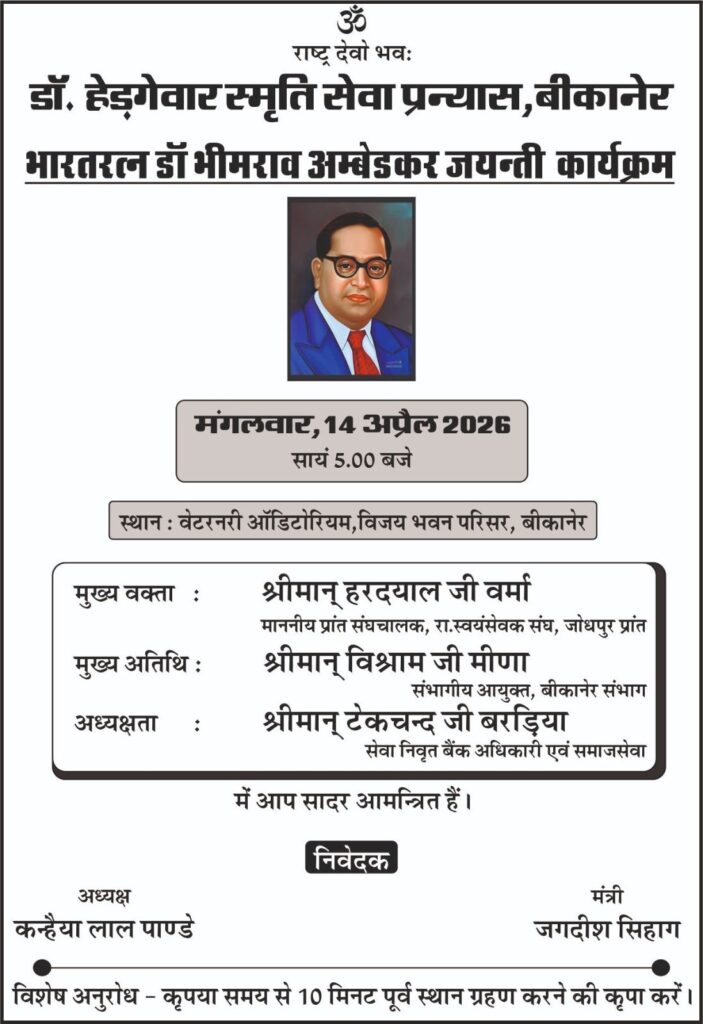 डॉ. हेडगेवार स्मृति सेवा न्यास, बीकानेर द्वारा भारतरत्न डॉ. भीमराव अम्बेडकर जयंती कार्यक्रम 14 अप्रैल को
