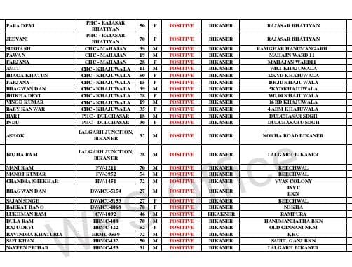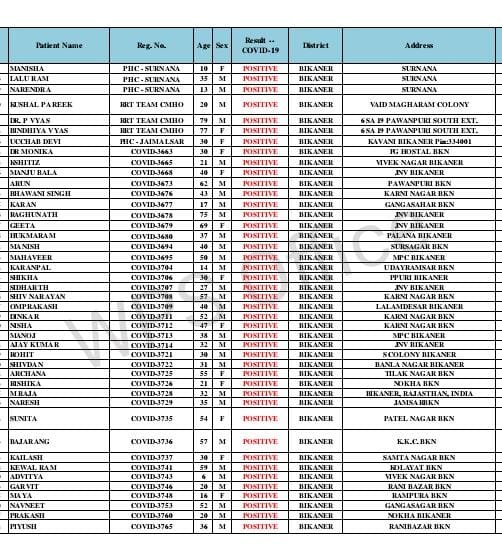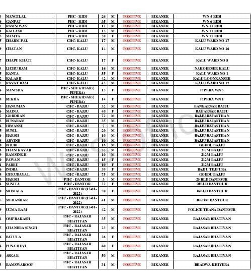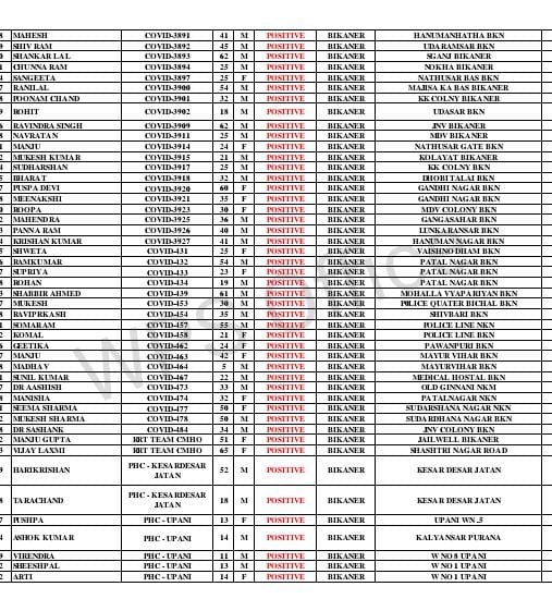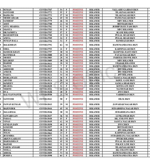 बीकानेर। बीकानेर में रविवार को स रिपोर्ट में 410कोरोना पॉजिटिव मिले थे वही सोमवार को पहली लिस्ट मे 207 रोगी मिले। मुक्ता प्रसाद, मुरलीधर व्यास कॉलोनी, बंगला.नगर, नत्थूसर गेट, समतानगर, रामपुरा, रोशनीघर चौराहा, गोपेश्वर बस्ती, सुभाष पुरा, पुरानी गिन्णी, वल्लभग, रानीसर बास, धोबीतलाई, देशनोक, लक्ष्मी नाथ घाटी, दम्माणी चौक, भट्टडो का चौक, पवनपूरी, सुदर्शना नगर, जेएनवी, गांधी कॉलोनी, करणीनगर, रानीबाजार, तिलकनगर,सुरनाना, मघाराम कॉलोनी,पवन पूरी ,कवानी, pg होस्टल,विवेक नगर, jnv, करनी नगर,गंगा सहर,पलना,सूरसागर मुक्त प्रसाद,लालमदेसर ,बंगला नगर, तिलक नगर,जामसर, पटेल नगर,kk कॉलोनी,समता नगर ,कोलायत,रानी बाजार,रामपुरा, वल्लभ गार्डन,शिव बड़ी,जोधपुर बायपास, सादुल गंज,हनुमान हत्था,पारीक चोक,उदासर,कोटगेट,, pbm, जवाहर नगर,सुदर्शन नगर,लूनकरनसर, पुलिस लाइन,माजीसा का बॉस,धोभी तलाई,गांधी नगर, खुलासा न्यूज़ को मिली रिपोट में ,हनुमान नगर,वैष्णो धाम,व्यापारियों का मोहल्ला,पुलिस quater बीछवाल,मयूर विहार,मेडिकल होस्टल,पुरानी गिनाणी,जैलवेल उपनी वार्ड नं 8,1, कल्याणसर, केसर देसर,रीड़ी वार्ड नं 4,6,11,15 ,कालू वार्ड ,17,16,8,1,पीपरा, वार्ड 5,1,बज्जूसे 8 ,गोडू, 2b2m,से 4 ,तेजपुरा,20bld दंतौर से 2,16bld 20khm, पुलिस थाना दंतौर,राजसर भाटिया से 5 ,भादवा