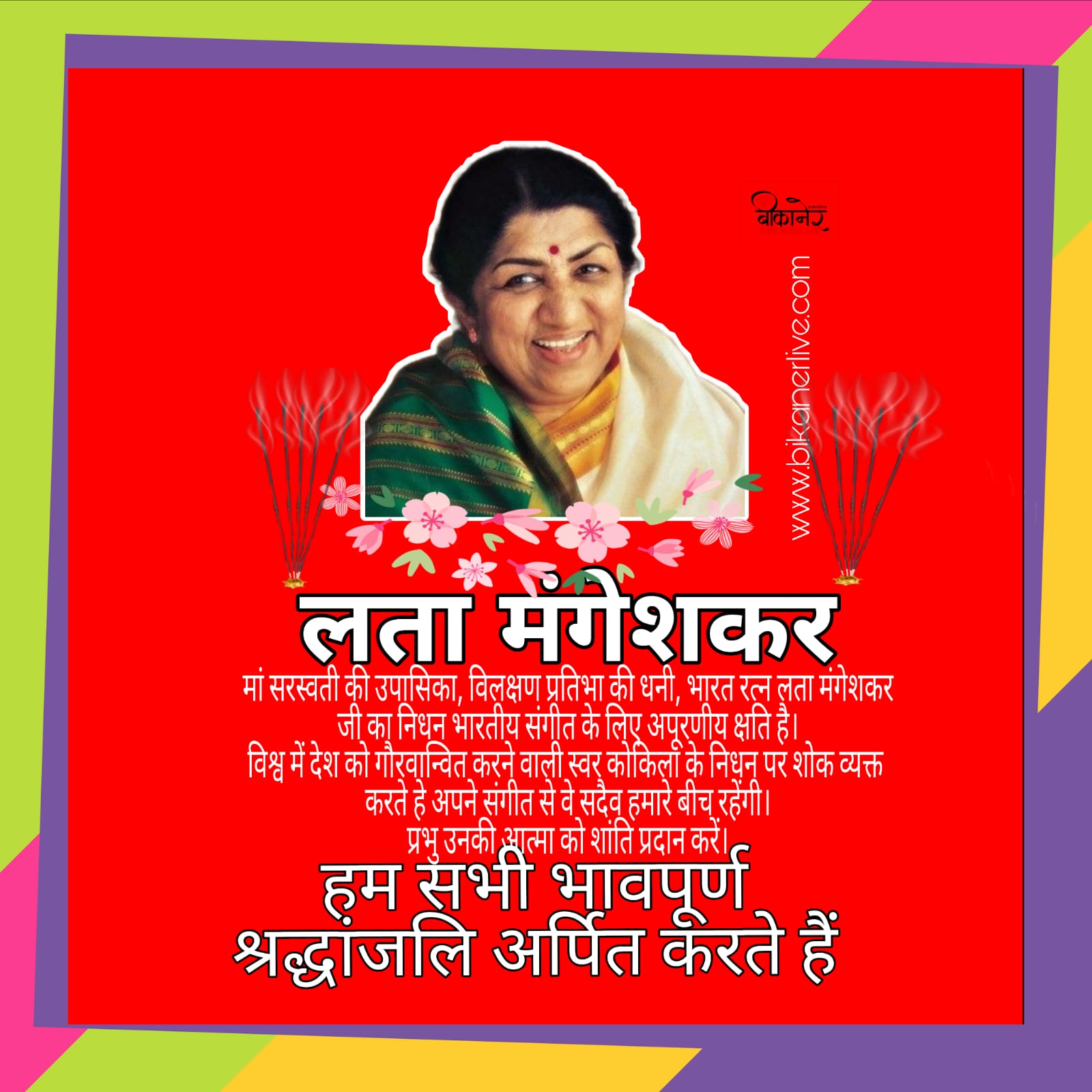 बीकानेर। देश की शान और संगीत जगत की सिरमोर, पद्मभूषण, पद्म विभूषण, दादा साहब फाल्के अवार्ड से सम्मानित भारत रत्न महान गायिका स्वर कोकिला लता मंगेशकर के निधन पर शहर भाजपा पदाधिकारियों ने शोक व्यक्त करते हुए इसे संगीत जगत के साथ-साथ पूरे देश के लिए अपूरणीय क्षति बताया है।