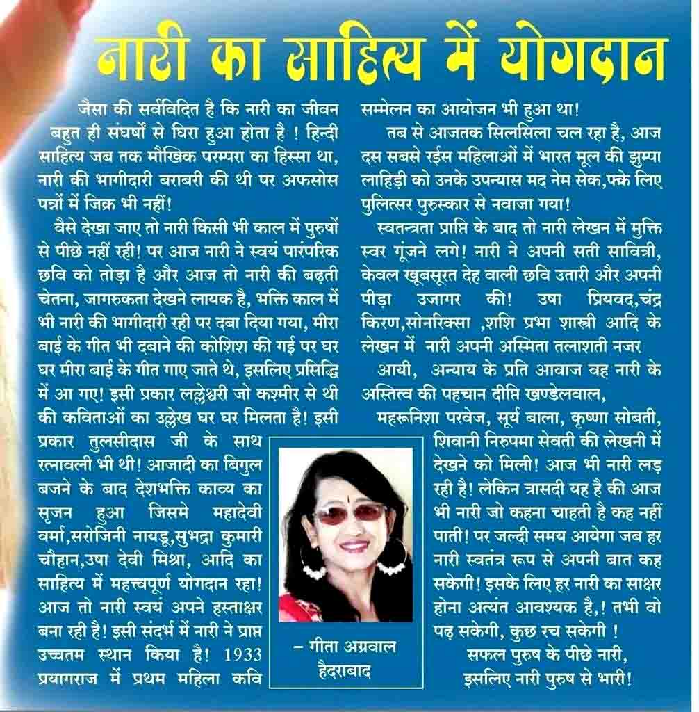 अभी हाल ही में 26 जनवरी 2022 को राजन चौधरी साहित्य पुरस्कार दक्षिण समाचारपत्र एवं साहित्य सेवा समिति, हैदराबाद के संयुक्त तत्वावधान में गीता अग्रवाल को नकद धन राशि, पदक व स्मृति चिन्ह प्रदान किए गए! नियमित रूप से पत्र पत्रिकाओं में कविताओं का प्रकाशन होता रहता है!