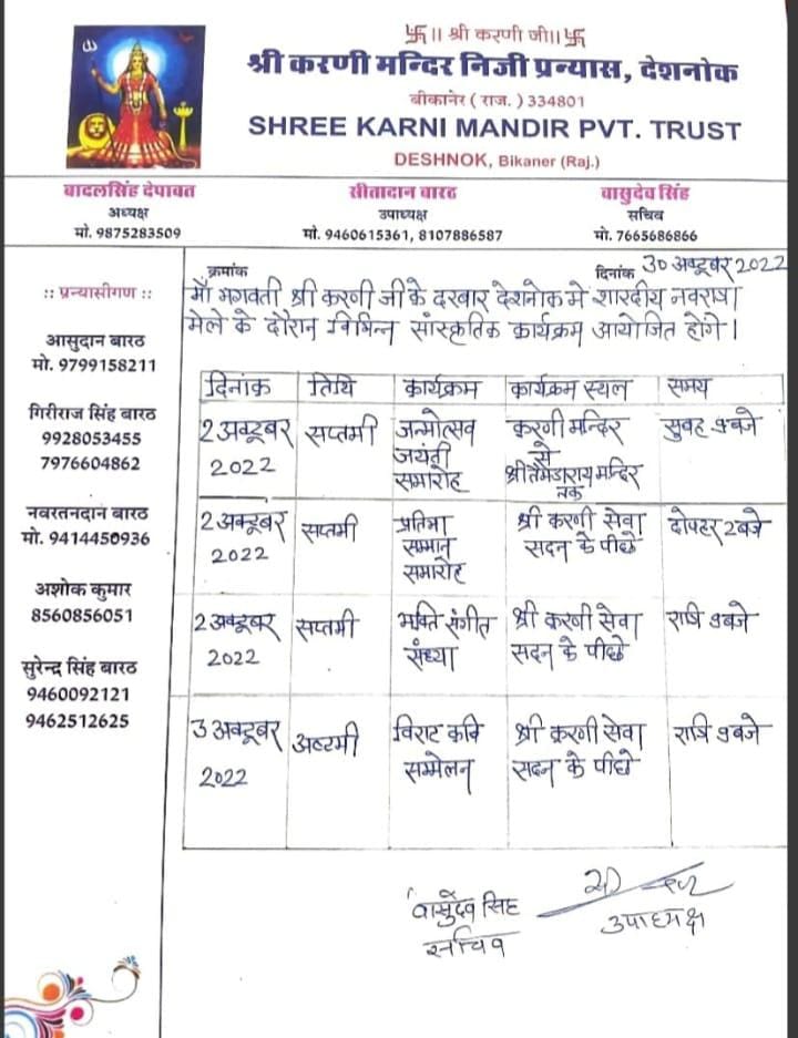 2 अक्टूबर 2022 करनी सेवा सदन के पीछे दोपहर 2:00 बजे प्रतिभा सम्मान समारोह भी रखा गया है रात्रि कालीन 9:00 बजे 2 अक्टूबर को करनी सेवा सदन के पीछे भक्ति संगीत कार्यक्रम का आयोजन किया गया है 3 अक्टूबर 2022 अष्टमी के दिन विराट कवि सम्मेलन श्री करणी सेवा सदन के पीछे रात्रि 8:00 बजे से प्रारंभ होगा कार्यक्रम की रूपरेखा ट्रस्ट सचिव वासुदेव एवं उपाध्यक्ष द्वारा जारी किया गया फोटोग्राफर कन्हैया लाल जोशी द्वारा प्रेषित