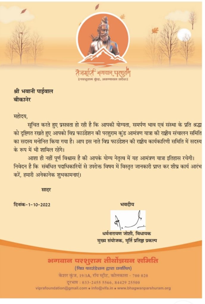 अरूणाचल प्रदेश स्थित परशुराम कुंड तीर्थोन्नयन में विप्र फाउंडेशन की ओर से 51′ पंचधातु की भगवान परशुराम की मूर्ति स्थापना के पावन प्रकल्प से देशवासियों को अवगत करवाने और उन्हें वहां पधारने का आह्वान करने हेतु एक रथ यात्रा का आयोजन किया जा रहा है। आयोजन की विस्तृत जानकारी शीघ्र ही प्रेषित की जायेगी। रथ यात्रा के संचालन हेतु निम्नांकित सात सदस्यीय राष्ट्रीय समिति का गठन किया जाता है :-