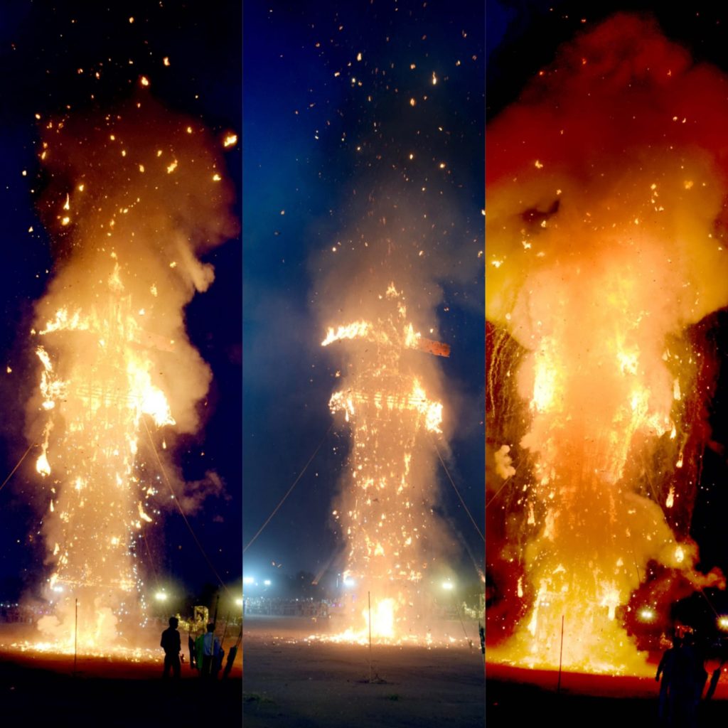 बीकानेर, 5 अक्टूबर। श्री राम लक्ष्मण दशहरा कमेटी की ओर से जिला प्रशासन के सहयोग से बुधवार को मेडिकल कॉलेज मैदान में 19 वां दशहरा उत्सव नायाब आतिशबाजी, सचेतन झांकियों, गगन भेदी धमाको के साथ दैत्यराज, रावण, कुंभकरण व मेघनाद तथा लंका के दहन के साथ मनाया गया। पुतलों के दहन के दौरान हजारों की तादाद में उपस्थित दर्शकों ने बुराई के प्रतीक रावण आदि के पुतलों के दहन के समय ’’ जयश्री राम’’ के नारों से गूंज उठा। दशहरा उत्सव स्थल पर पिछले वर्षों की तुलना में चार गुना भीड़ थीं।