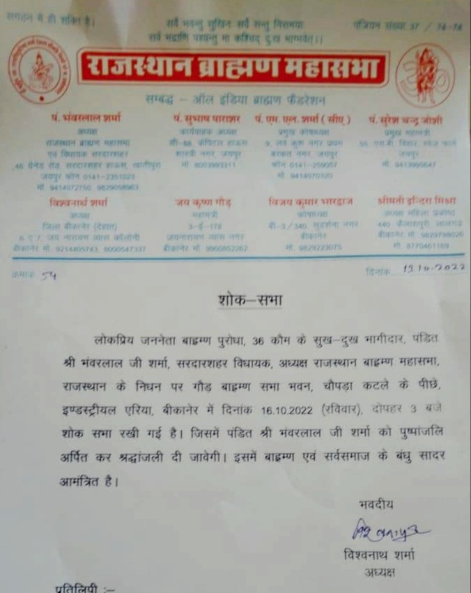 बीकानेर 13 अक्टूबर 2022 लोकप्रिय जन नेता ब्राह्मण पुरोधा 36 कॉम के सुख-दुख के भागीदार पंडित श्री भंवर लाल जी शर्मा सरदार शहर विधायक अध्यक्ष राजस्थान ब्राह्मण महासभा राजस्थान के निधन पर गौड़ ब्राह्मण सभा भवन चोपड़ा कटले के पीछे इंडस्ट्रियल एरिया बीकानेर में दिनांक 16 अक्टूबर 2022 रविवार दोपहर 3:00 बजे शोक सभा रखी गई है जिसमें पंडित श्री भंवर लाल जी शर्मा को पुष्पांजलि अर्पित कर श्रद्धांजलि दी जावेगी इसमें ब्राह्मण व सर्वसमाज के बंधु सादर आमंत्रित हैं! श्रद्धांजलि सभा का आयोजन की सूचना अध्यक्ष विश्वनाथ शर्मा जिला बीकानेर द्वारा प्रेषित की गई !