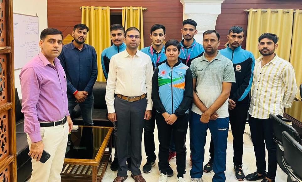 बीकानेर, 14 अक्टूबर। गुजरात में गत दिनों आयोजित 36वें राष्ट्रीय खेलों में एक स्वर्ण व दो कांस्य पदक विजेता साइक्लिंग खिलाड़ियों ने शुक्रवार को जिला कलेक्टर श्री भगवती प्रसाद कलाल से मुलाकात की। जिला कलेक्टर ने साइकिल धावकों को बधाई दी और उनकी हौसला अफजाई की।