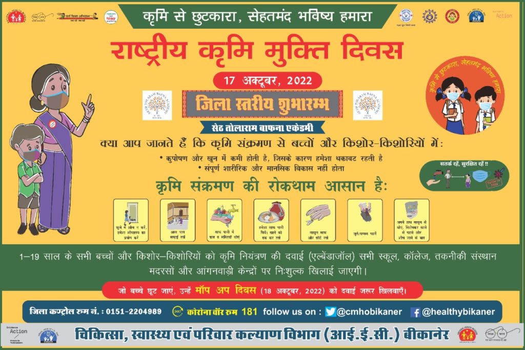 बीकानेर, 16 अक्टूबर। बच्चों-किशोरों में कुपोषण की रोकथाम, शारीरिक एवं मानसिक विकास के लिये चिकित्सा एवं स्वास्थ्य विभाग द्वारा 17 अक्टूबर सोमवार को राष्ट्रीय कृमि मुक्ति (डीवर्मिंग) दिवस मनाया जाएगा। स्वास्थ्य, शिक्षा तथा महिला एवं बाल विकास विभाग के संयुक्त तत्वावधान में आयोज्य कार्यक्रम के तहत 1 वर्ष से लेकर 19 वर्ष तक के बच्चों व किशोरों को आंगनबाडी केंद्रों, स्वास्थ्य केंद्रों, सरकारी-निजी विद्यालयों व मदरसों में पेट के कीड़े मारने की दवा एलबेण्डाजोल गोली निशुल्क खिलाई जाएगी। दिवस का जिला स्तरीय शुभारम्भ जिला कलक्टर भगवती प्रसाद कलाल द्वारा स्थानीय सेठ तोलाराम बाफना एकेडमी, गंगाशहर से किया जाएगा।