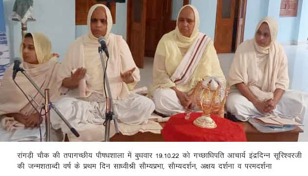साध्वी सौम्यप्रभा, सौम्यदर्शना, अक्षय दर्शना व परम दर्शना के सान्निध्य में हुए कार्यक्रम में अनेक श्रावकन्श्राविकाओं ने जिनालयों में दर्शन करने, विभिन्न तरह की तपस्याएं करने, अभक्ष्य वस्तुओं का त्याग करने तथा परमात्मा का स्मरण करते हुए जैन धर्म के अनुसार साधना-आराधना व भक्ति के नियमों का संकल्प लिया। राजस्थान संस्कृत अकादमी की अध्यक्ष डॉ.सरोज कोचर, महक रामपुरिया, जितेन्द्र कोचर, साध्वीवृंद चातुर्मास संयोजक सुरेन्द्र बद्धानी ने गच्छाधिपति आचार्य विजय इन्द्रदिन्न सूरिश्वरजी के आदर्शों का स्मरण दिलाया। वरिष्ठ श्रावक सुरेन्द्र बद्धानी ने साधार्मिक फड़ राशि का विसर्जन किया। महेन्द्र, विमल, रोनक व रोहित कोचर ने भक्तिगीतों से वंदना की। अनेक बड़ी संख्या में श्रावक-श्राविकाओं ने आयम्बिल की तपस्या की।