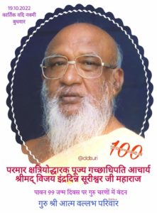 बीकानेर, 19 अक्टूबर। जैन श्वेताम्बर तपागच्छ के गच्छाधिपति आचार्य श्रीमद्् विजय इंद्रदिन्न सूरिश्वर महाराज के 99 वें जन्म दिवस व जन्म शताब्दी वर्ष के प्रथम दिन बुधवार को रांगड़ी चौक की तपागच्छीय पौषधशाला में जप,तप, त्याग, चारित्र, प्रवचन, गुणानुवाद सभा हुई तथा 100 दीयों की दीपमाला से गुरुदेव का स्मरण व वंदन किया गया।