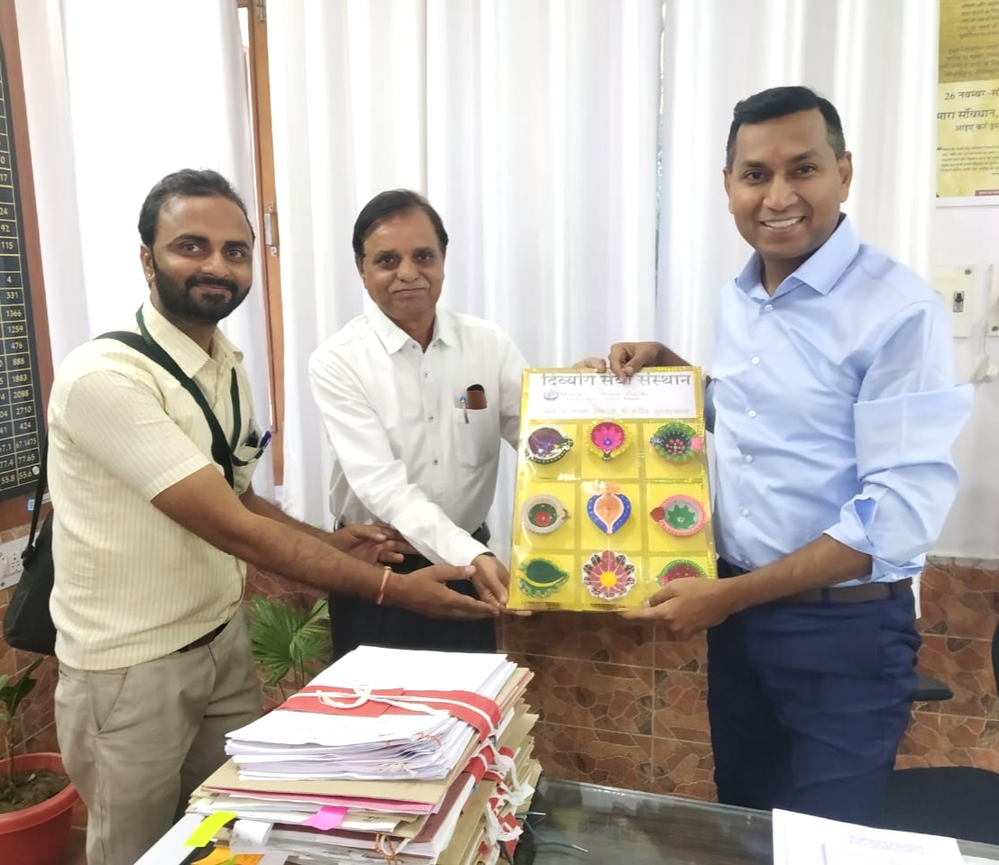 बीकानेर, दिनांक : 20/10/2022 दिव्यांग सेवा संस्थान बीकानेर की तरफ से आज संभागीय आयुक्त नीरज के पवन को दीपावली त्योहार की शुभकामनाएं दी। इस अवसर पर संस्थान के अध्यक्ष अंबाराम इणखिया एवं सचिव जेठा राम ने संभागीय आयुक्त को दिव्यांग बच्चों द्वारा निर्मित कलात्मक दीपक भेंट किए तथा , संस्थान द्वारा दिव्यांग बच्चों की शिक्षा, प्रशिक्षण, पुनर्वास व व्यवसाय संबंधी गतिविधियों की जानकारी दी। आयुक्त महोदय ने दिव्यांग बच्चों द्वारा बनाई गई सुंदर कलात्मक दीपक की प्रशंसा की तथा उनके उज्ज्वल भविष्य की मंगल कामना की। अपने इरादों को इतना मजबूत रखना कि दिव्यांग से दिव्य बन जाओ. अपने जीवन की डिक्शनरी से “दिव्यांग” और “विकलांग” शब्द निकाल दे. और दुनिया को दिखा दो आप वो कर सकते है जो सभी करते है.