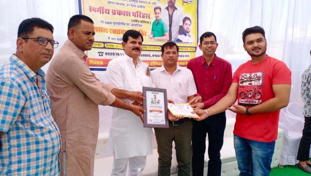 बीकानेर। कस्बे के स्वास्थ्य केन्द्र के नर्सिंग ऑफिसर रहे स्व. प्रकाश पड़िहार की प्रथम पुण्यतिथि पर गुरूवार को कस्बे की सीएचसी में रक्तदान शिविर का आयोजन किया गया। रक्तदान शिविर में डॉ. बीआर अम्बेडकर पीठ के महानिदेशक मदन गोपाल मेघवाल,कन्हैयालाल झंवर, आर्किटेक्ट एसके बेरी, डॉ. श्रीगोपाल गोयल, बीकानेर पंचायत समिति प्रधान लालचंद आसोपा, पूर्व सरपंच नरेन्द्र सिंह, नापासर सरपंच प्रतिनिधि रतिराम तावणियां, डॉ. रमेश कड़ेला, डॉ. तनवीर मलावत, नगर विकास न्यास के तहसीलदार कालूराम परिहार, राजपाल अहलावत,