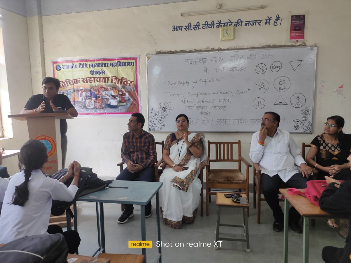 बीकानेर, 28 अक्टूबर। राजकीय विधि स्नातकोत्तर महाविद्यालय बीकानेर में राजस्थान राज्य महिला नीति 2021 के तहत सड़क सुरक्षा एवं यातायात नियमों एवं यातायात साधनों के परिवहन एवं लाइसेंस प्रक्रिया विषय पर एक विधिक सहायता शिविर का आयोजन किया गया