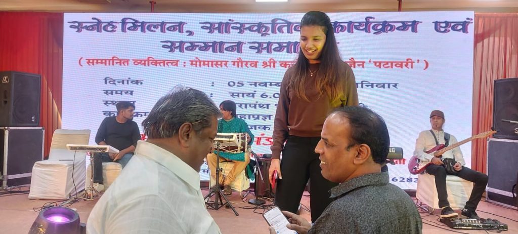 तोलाराम मारू – स्नेह मिलन सांस्कृतिक कार्यक्रम एवं सम्मान समारोह मोमासर गौरव कन्हैयालाल जैन पटावरी के सम्मान समारोह से पूर्व कनहैयालाल जी ने सभी आगंतुकों आभार व्यक्त किया और दूर दूर से आए सब जनों ने हार्दिक शुभकामनाएं बधाई दी और शुभकामनाएं तथा दीर्घायु की मंगल कामनाएं की। उपसरपंच जुगराज संचेती जी ने कहा कि हमें ऐसे व्यक्तित्व भामाशाह सामाजिक कार्यकर्ता शिक्षा चिकित्सा पर्यावरण क्षेत्र में सदैव अग्रणी रूप से आर्थिक सहयोग देने वाले कन्हैयालाल जेन पर हमें गर्व है। इस अवसर पर के एवं जैन के सुपुत्र हेमन्त जेन एवं पुत्र वधु सुनाली ने उपस्थित जनों से आशीर्वाद प्राप्त किया। उपसरपंच जुगराज संचेती ने बताया कि आप का पूरा परिवार धार्मिक एवं सात्विक परिवार है।